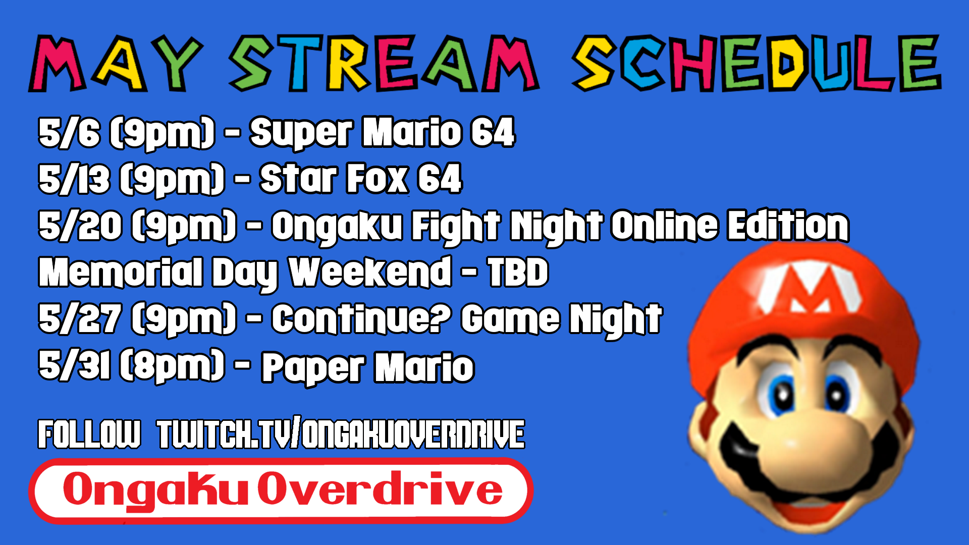 We may do some bonus streams, and we’re still figuring out Memorial Day weekend. We could use it to wrap up games, or attempt an online, multiplayer stream. Speaking of which, for this month’s Ongaku Fight Night, we are planning a Tekken 7 online tournament for fun. We have a voice channel set up on our Discord server for smacktalk. It should be pretty fun. For our Wednesday night streams, our Patreon supporters decide on the games we play, so be sure to do subscribe!
