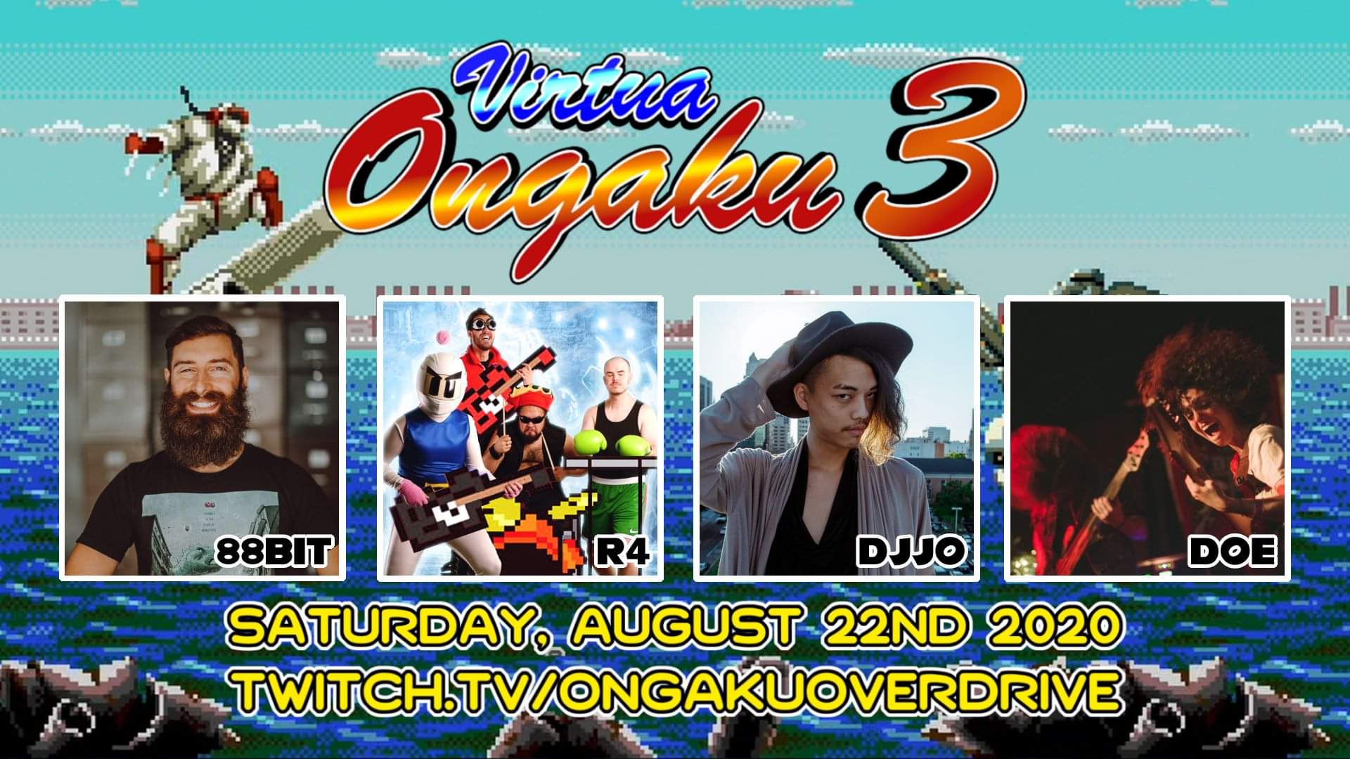 The lineup for Virtua Ongaku 3 features Cleveland-based pianist 88bit, Canadian progressive rock band The Runaway Four, Orlando-based VGM/anime EDM producer dj-Jo, and Austin video game metal band Descendants of Erdrick.